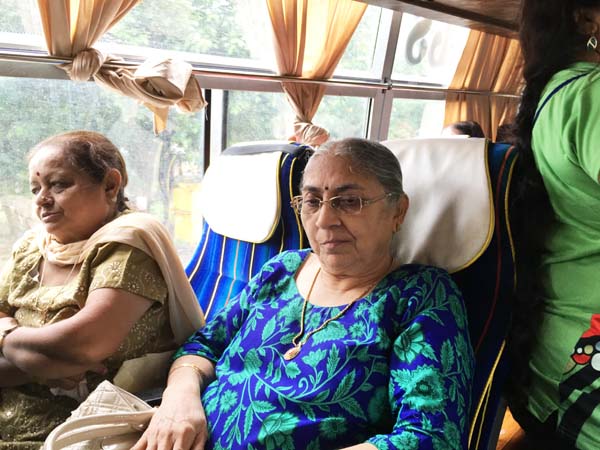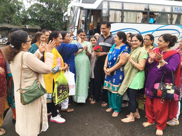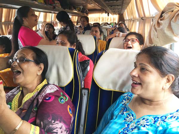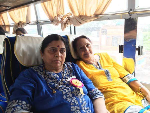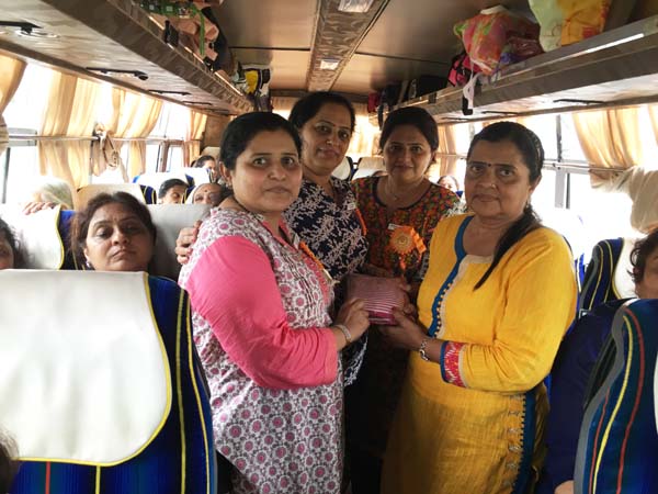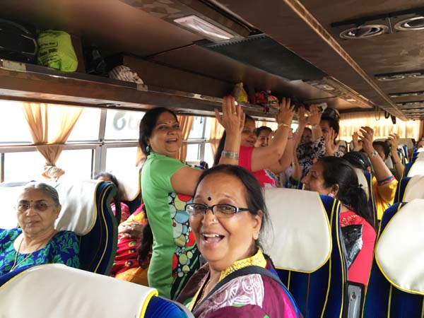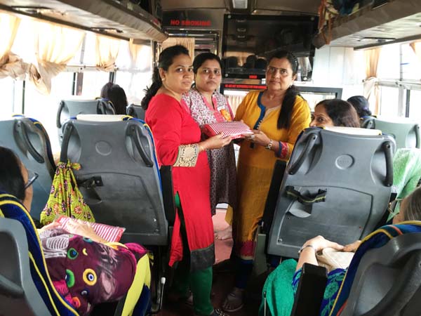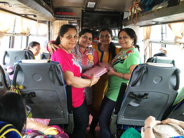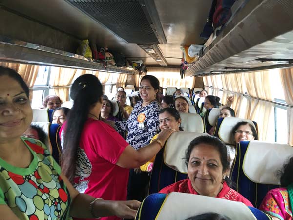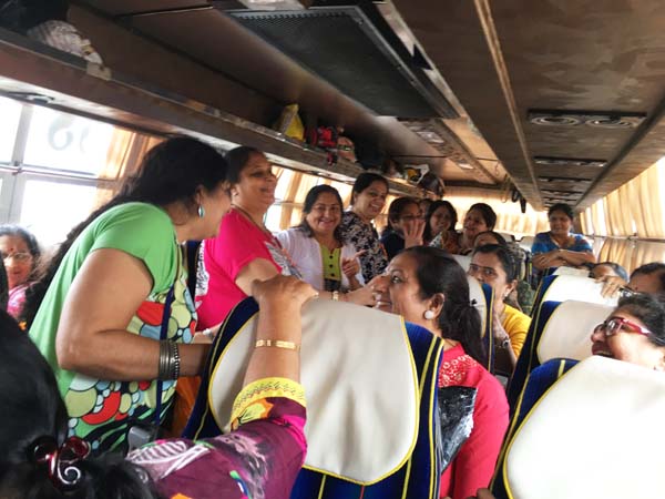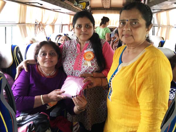 After an hour of shopping, it was time for return journey. Delicious Gujarati Lunch was arranged at Pangat Thali – Nashik. Mamta Randeria, Varshaben Lapsiwala and Jyoti Chapatwala hosted the game of Share Bazaar which everyone thoroughly enjoyed. Then it was time for our national pastime ‘Antakshri’. Teatime was at a highway restaurant where special masala tea was prepared by Mrs. Pravina Modi. Sprite Cold-Drink Bottles, Apples, Chocolates were distributed on both the days in the bus by the Comittee Members – Jagruti Asmani, Madhavi Mody, Deepa Khatiwala, Jyoti Chapatwala and Jayeshreeben Dadarwala. Last but not the least, specially ordered surati specialities like ‘Sarasia Khaja’ and ‘Rava Ladoos’ were distributed to all the members as late evening snack. The JMM committee thanks Mrs. Minaxiben Bodawala( SMV Mahila Mandal President – Surat ) for arranging these surati specialities for us. Free gift of a set of three travel pouches was sponsored by Prabhaben Patel and Madhaviben Modi for all the trip members.