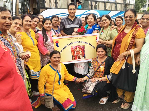 Next day, Breakfast was served of special items ordered from Surat. After breakfast, everyone proceeded to the Sai Baba Temple for Baba’s Darshan. Everybody did the Darshan easily as VIP passes were given to them by the Mandal. All the ladies did the Darshan of Hanuman Temple, Baba’s Chavdi & Dwarkamai Temple. The arrangements of Trambakeshwar & Shirdi like VIP passes for Darshan, food & rooms were done by Ajaybhai Boghawala & Dipikaben Boghawala. Ajaybhai Boghawala & Kaminiben Bamania honoured Prabhaben with a bouquet and a shawl. Ajaybhai was also honoured & thanked with a bouquet and a shawl by Daminiben Dhabuwala on behalf of the JMM. A Gift was given to Kaminiben Bamania by Jagruti Asmani and Madhvi Modi. Prabhaben also gave a gift for Dipikaben Boghawala to Ajaybhai as token of Thanks.